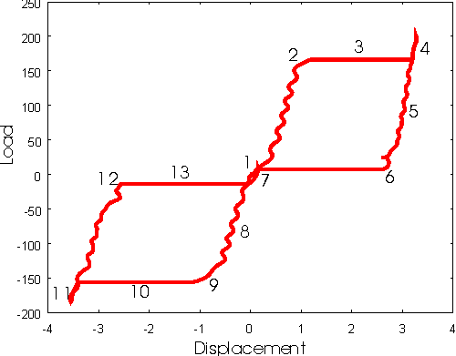 Afterwards the body may be loaded in the opposite direction, and a symmetric load-displacement plot is shown: Linearly-elastic loading of the austenite (8), the occurrence of a critical yield load (9), the large displacement along the yield-line (10) and the linearly-elastic shear of the martensite (11). Upon unloading: Unloading along the martensitic elastic line (11-12), the occurrance of the recovery load (12), the recovery line into the austenitc state (13).